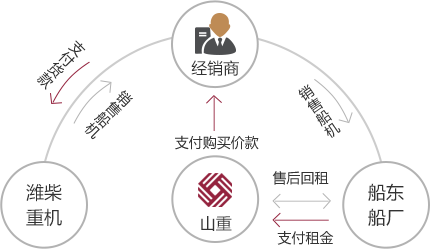 濰柴重機(jī)將船機(jī)銷售給經(jīng)銷商,經(jīng)銷商向濰柴重機(jī)支付貨款;經(jīng)銷商將船機(jī)銷售給船東或船廠;山重租賃與船東或船廠操作售后回租,并向經(jīng)銷商支付設(shè)備款;船東或船廠按期向山重租賃支付租金。