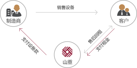 客戶從制造商或經(jīng)銷商處購(gòu)買物流設(shè)備,再與山重租賃操作售后回租;山重租賃向工廠或經(jīng)銷商代付設(shè)備款,客戶按期向山重租賃支付租金。